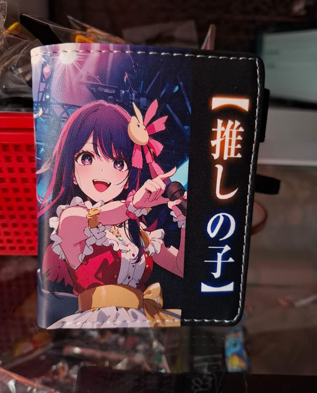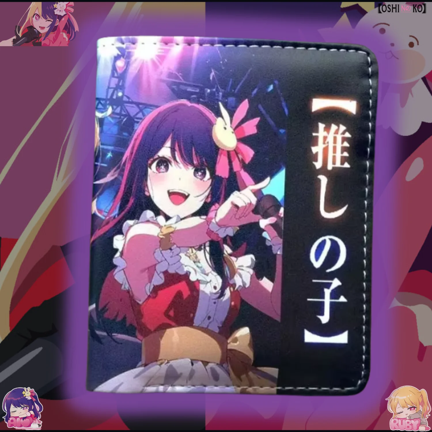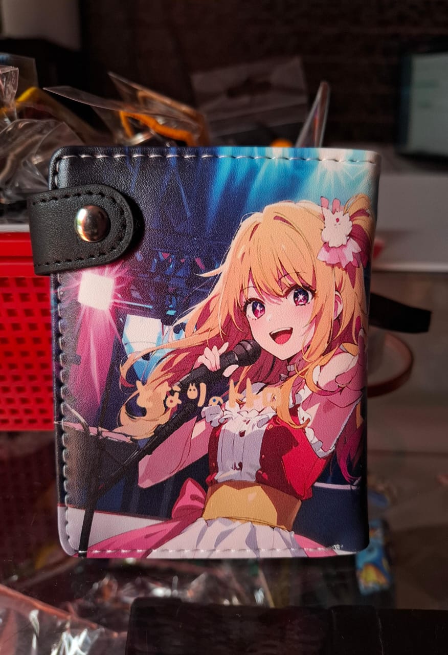 Billetera del anime Oshi no ko con los personajes Ai Hoshino y Ruby Hoshino, tiene espacio para billetes, identificaciones, tarjetas y monedas.